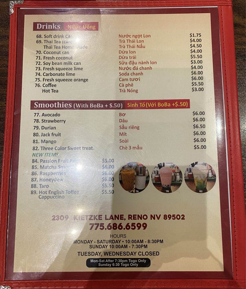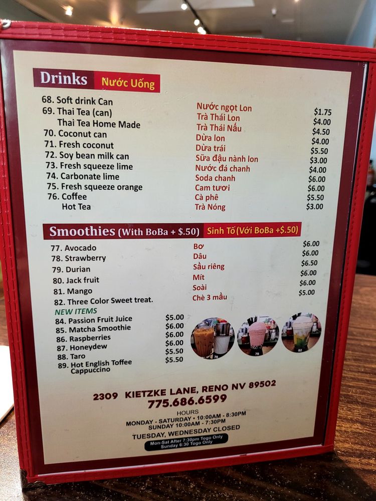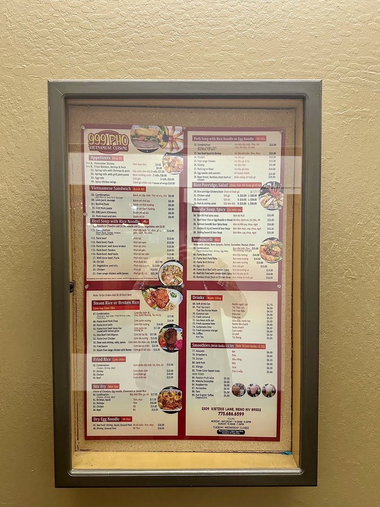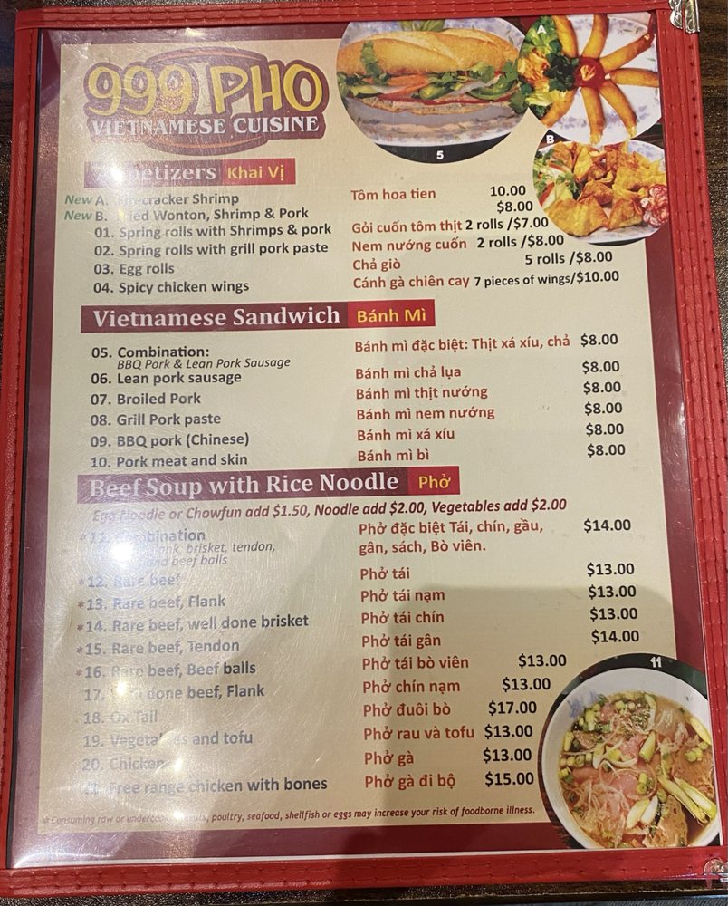 Introducing the menu at 999 Pho, a Vietnamese gem in Reno, NV. Offering a variety of dishes like Banh Mi Dac Biet and Bun Bo Kho, this restaurant impresses with its flavorful broths and quality ingredients. Customers rave about the grilled pork vermicelli bowl and Firecracker Shrimp appetizer. The casual ambiance and friendly staff make dining here a pleasant experience. With a convenient location and options for delivery, takeout, and reservations, 999 Pho is a go-to spot for lunch or dinner. Whether you're a pho enthusiast or looking to explore Vietnamese cuisine, this restaurant is a must-try.